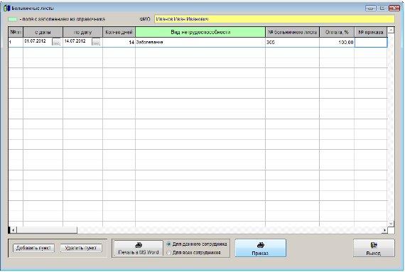 Предварительно должна быть добавлена запись с информацией по больничному листу.