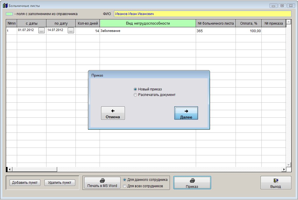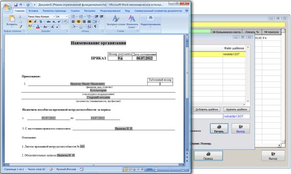 Приказ по больничному листу сформируется в установленном Microsoft Word либо при соответствующей настройке в OpenOffice Writer.