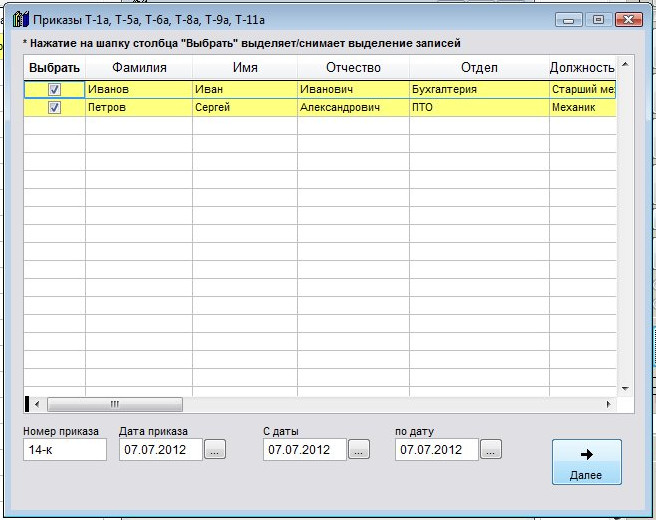 Галочками выберите сотрудников, на которых формируется приказ (для выбора всех сотрудников нажмите на шапку столбца Выбрать), установите даты и нажмите кнопку Далее.