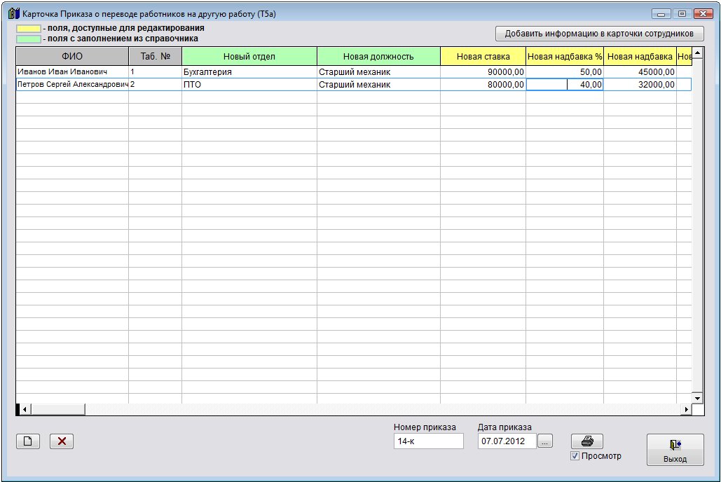 Для занесения информации о приказе в соответствующий раздел карточек сотрудников нажмите кнопку "Занести информацию в карточки сотрудников".