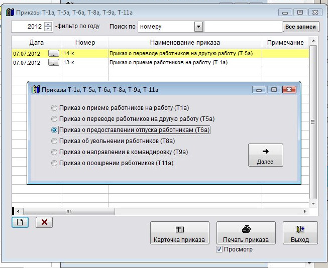 Затем выберите приказ, который требуется создать, Приказ на отпуск (Т6а), и нажмите кнопку Далее.