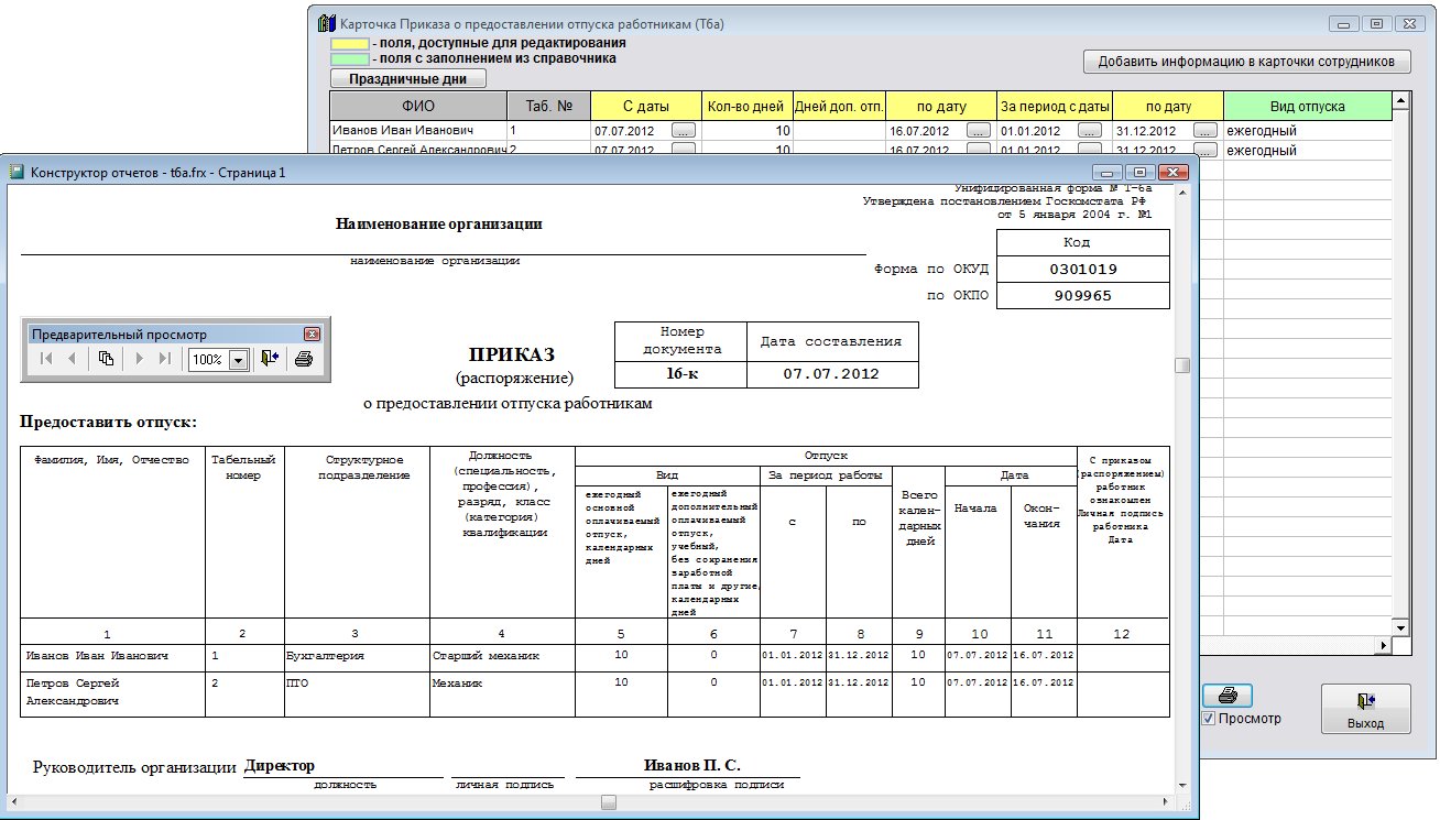 В случае, если галочка "Просмотр" установлена, откроется окно предварительного просмотра - "Конструктор отчетов".