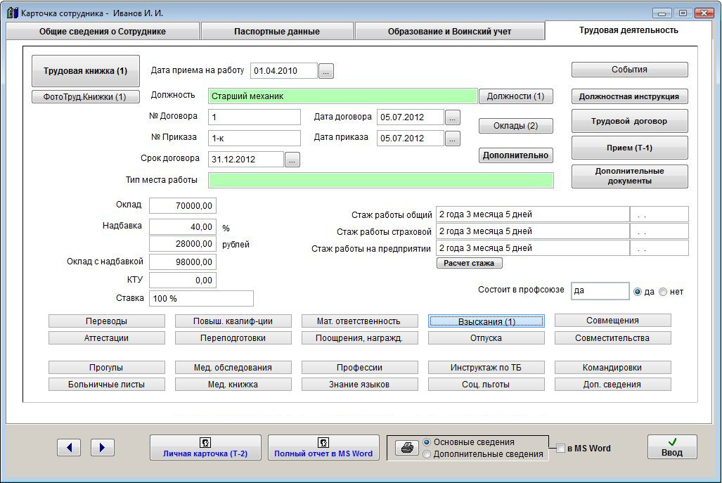 Для печати приказа о взыскании сотрудника откройте карточку сотрудника на редактирование (кнопка Изменить карточку в журнале сотрудников) и нажмите кнопку "Взыскания" в закладке "Трудовая деятельность".