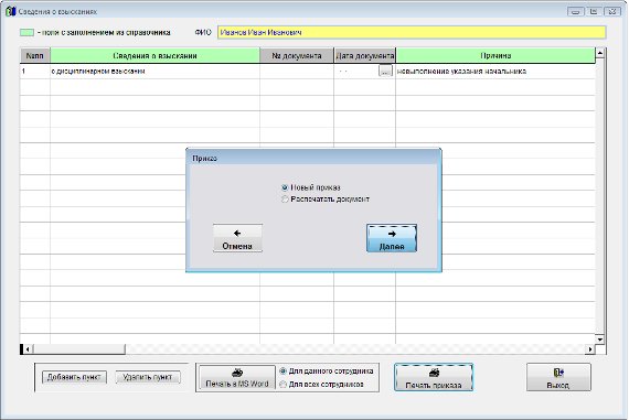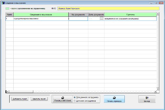 Для печати приказа о взыскании сотрудника в разделе "Сведения о взысканиях" выберите нужную запись в таблице и нажмите кнопку "Печать приказа".