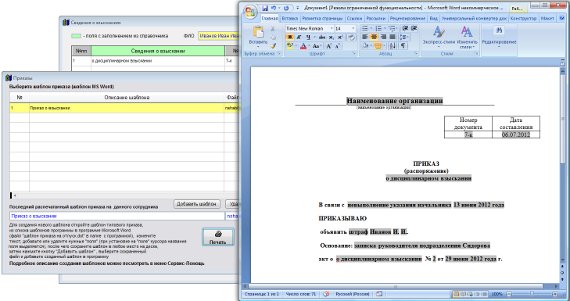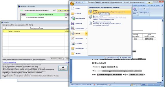 В программе есть возможность формировать приказы в установленном Microsoft Word либо при соответствующей настройке в OpenOffice Writer на базе своих шаблонов.