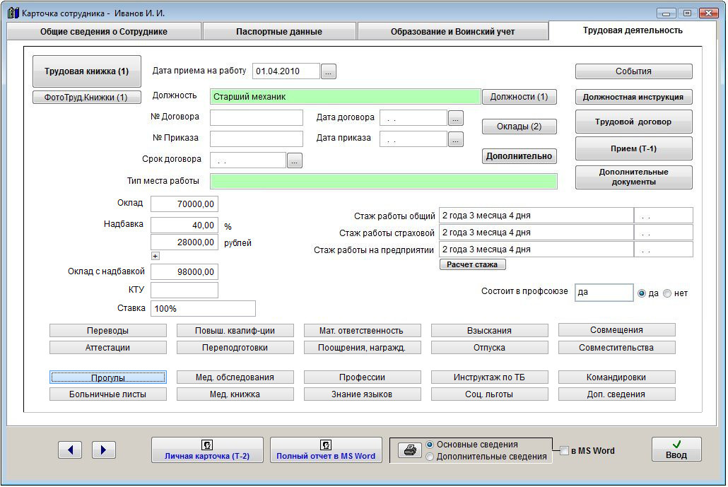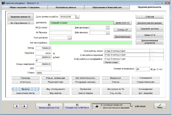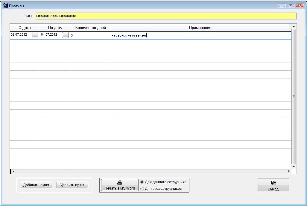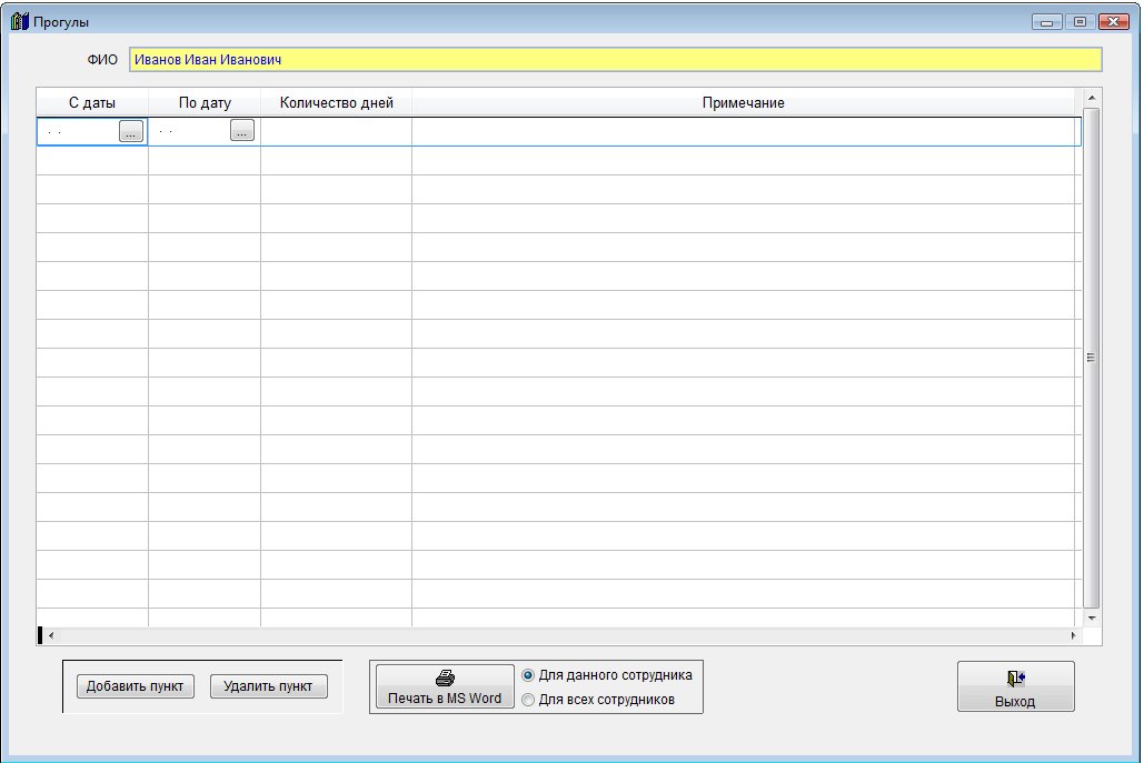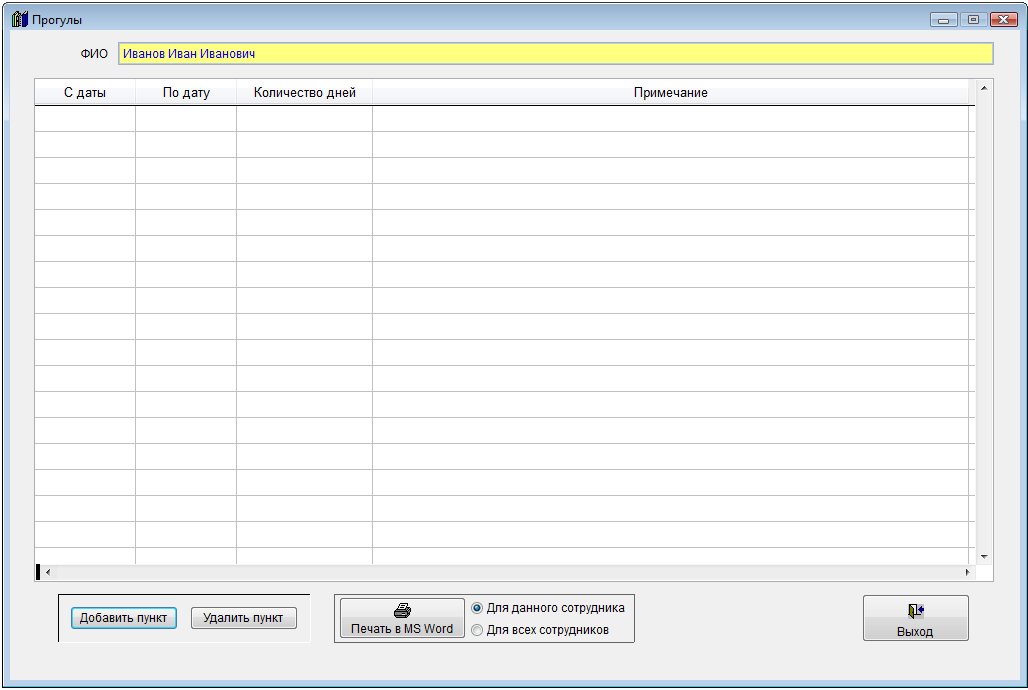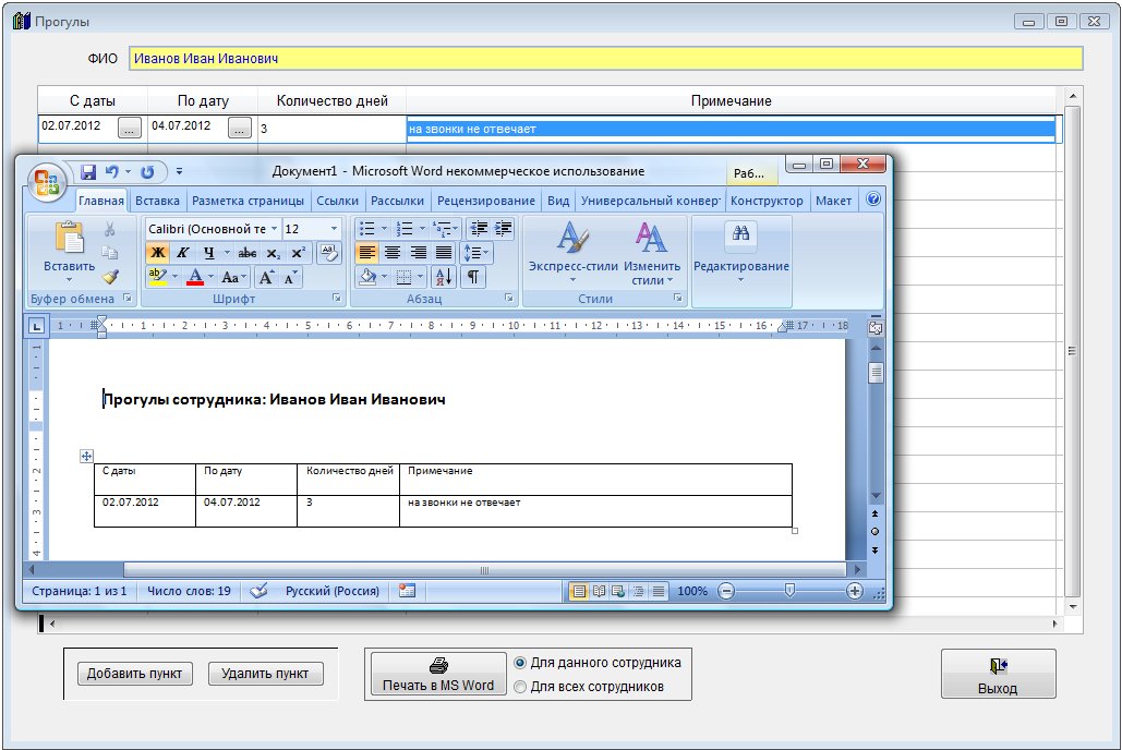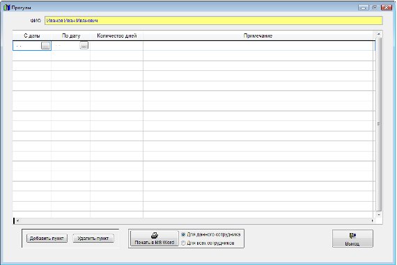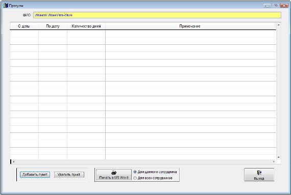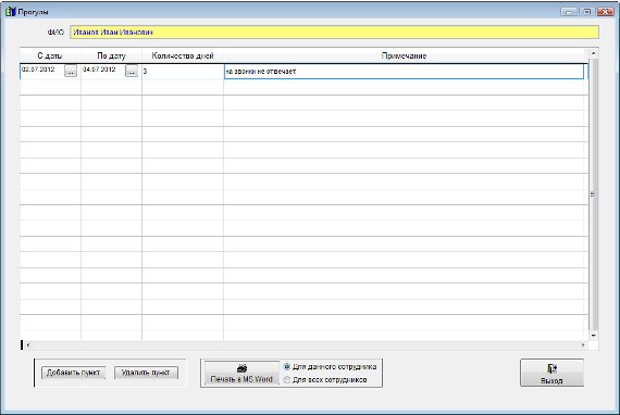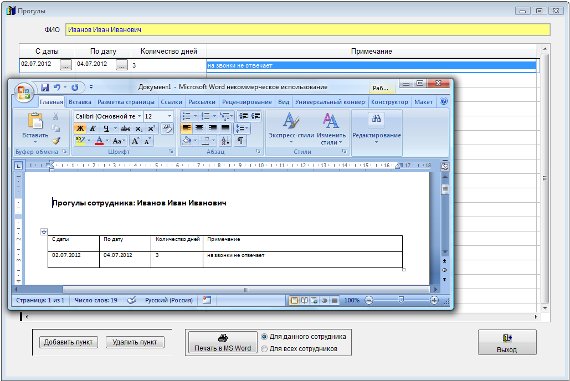 Если установлена опция "Для данного сотрудника", то в MS Word (OO Writer) , будет выведена информация только по данному сотруднику.