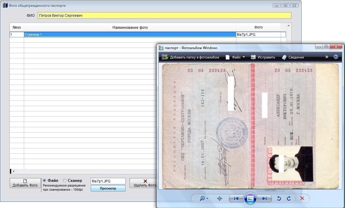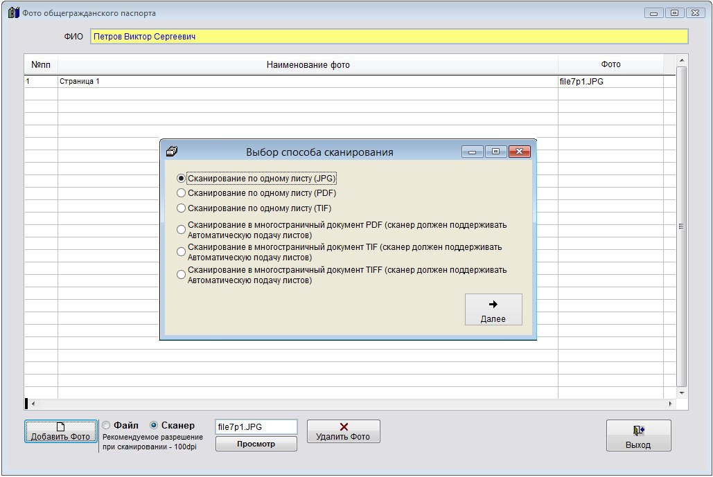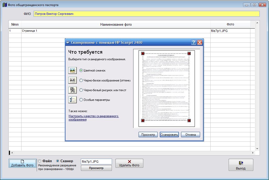 Для получения изображения сразу со сканера установите опцию "Сканер" и нажмите кнопку "Вставить Фото".