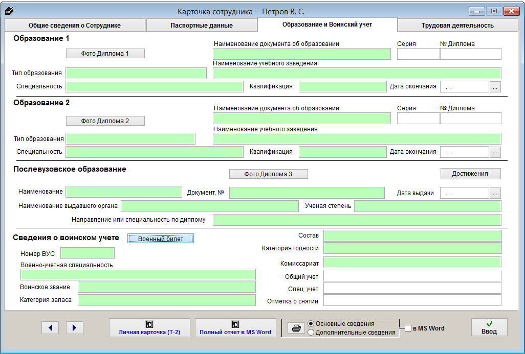 В карточке сотрудника имеется возможность прикрепить отсканированные копии документов (паспорта, заграничного паспорта, военного билета).