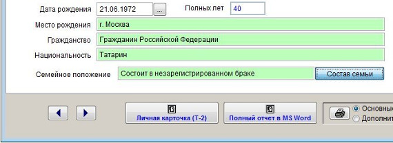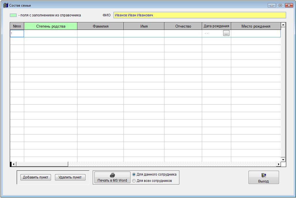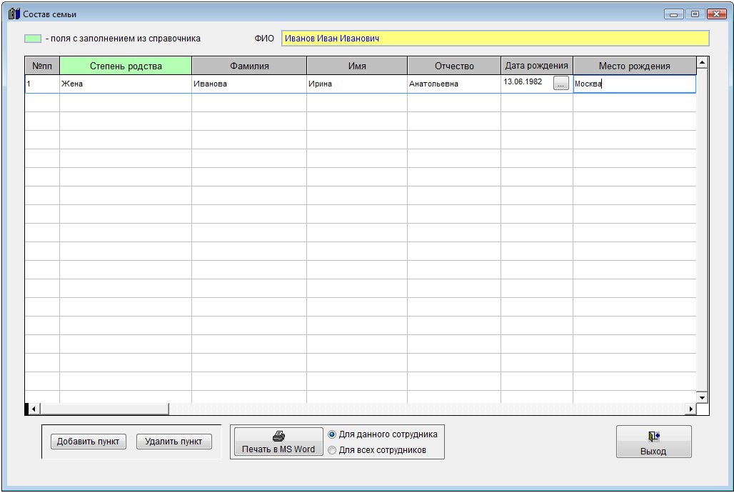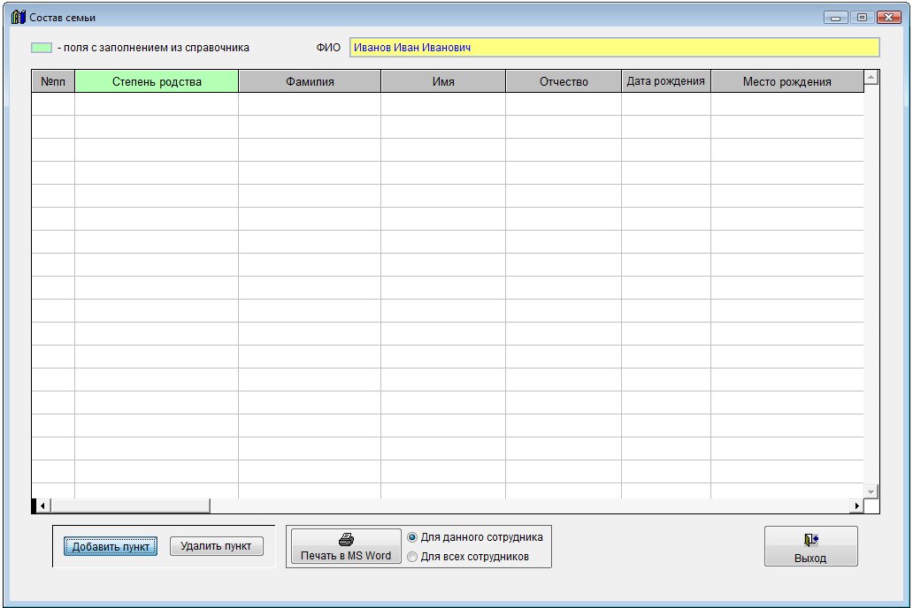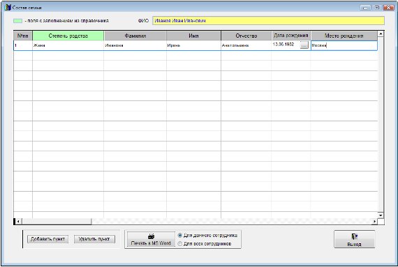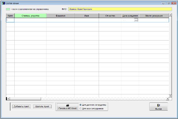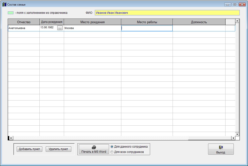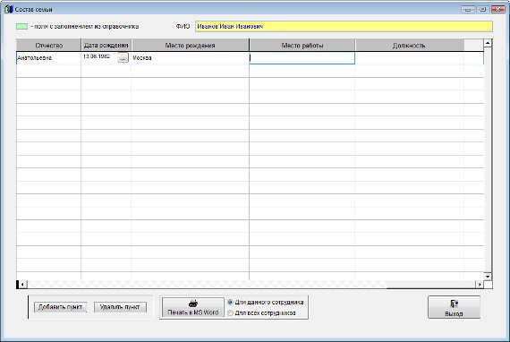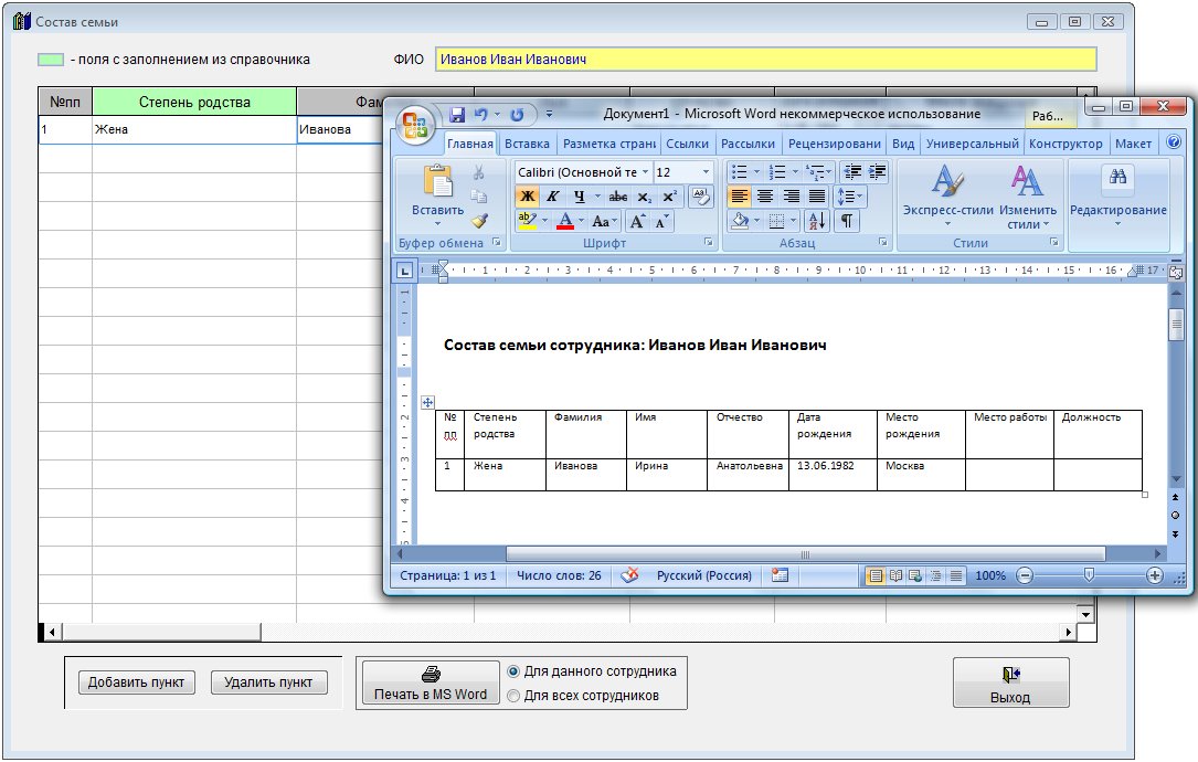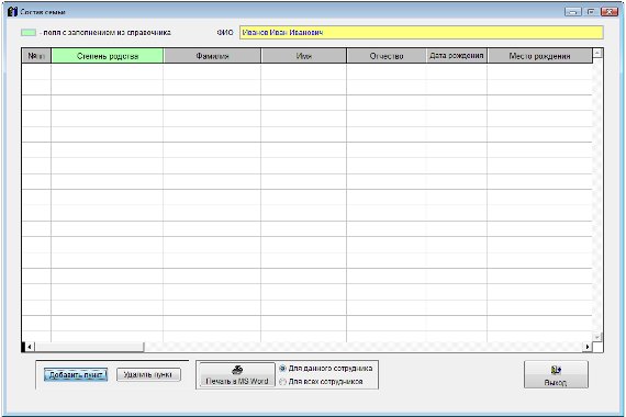 Если установлена опция "Для данного сотрудника", то в MS Word (OO Writer) , будет выведена информация только по данному сотруднику.