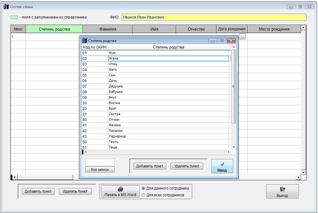 Поле "Степень родства" в Составе семьи заполнится выбранным значением.