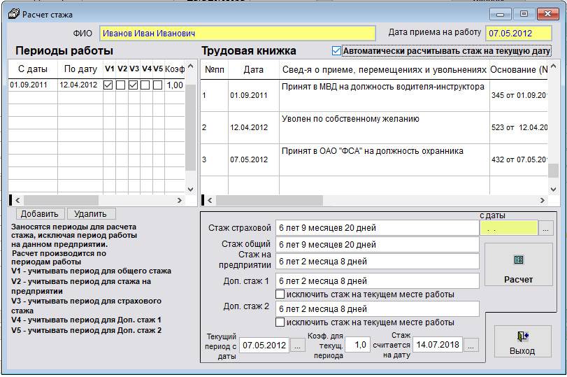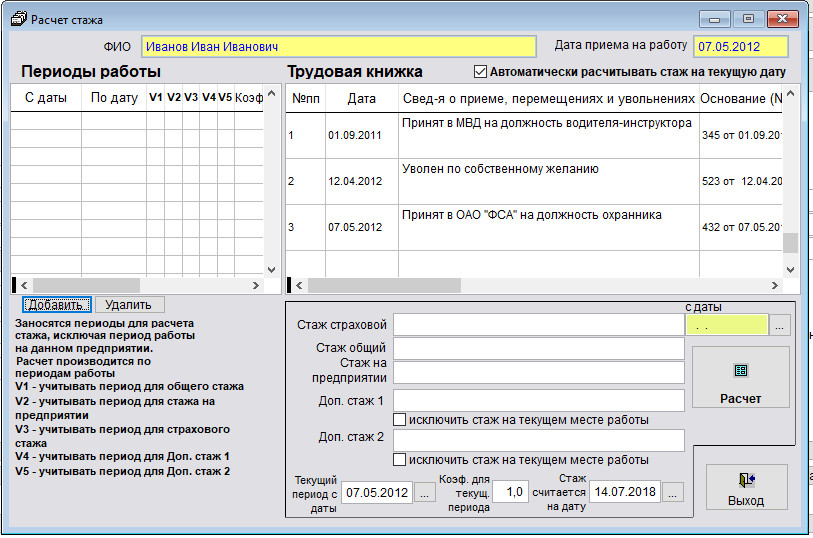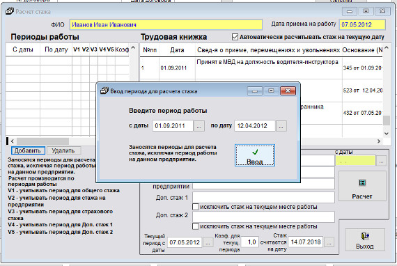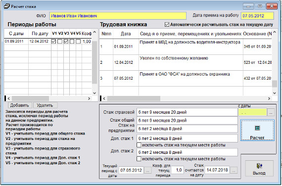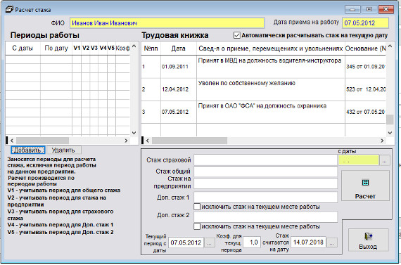 В программе есть возможность расчета трех видов стажа - стажа работы на предприятии, общего и страхового.