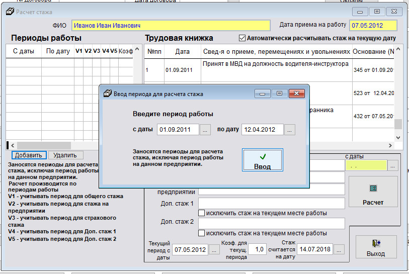 Стаж будет посчитан в соответствии с введенными периодами, датами и коэффициентами.