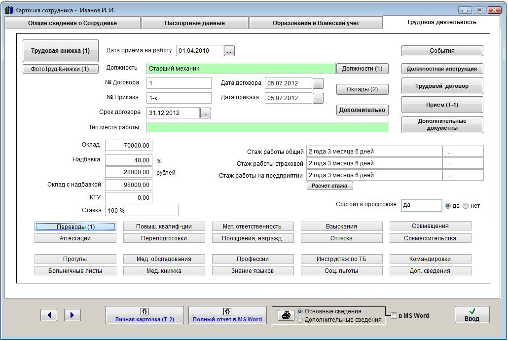 Для печати приказа о переводе Т-5 сотрудника откройте карточку сотрудника на редактирование (кнопка Изменить карточку в журнале сотрудников) и нажмите кнопку "Переводы" в закладке "Трудовая деятельность".