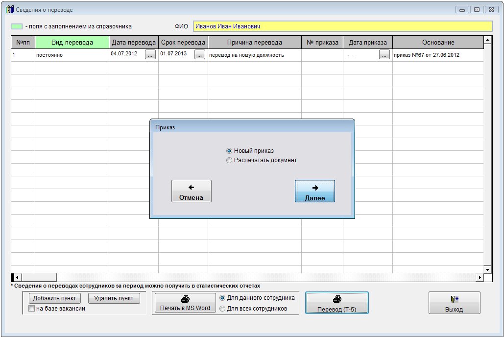 В случае, если включена автоматическая нумерация приказов, номер и дата приказа заполняются автоматически при печати приказа (кнопка "Перевод (Т-5)") и последующем выборе опции "Новый приказ", а запись о приказе автоматически попадет в журнал кадровых приказов.