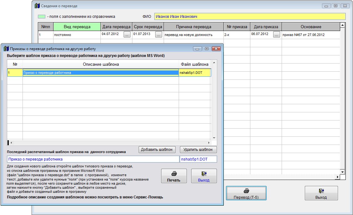 Откроется окно, в котором можно распечатать приказ о переводе Т-5 на базе шаблона, добавить в программу свои шаблоны приказов.