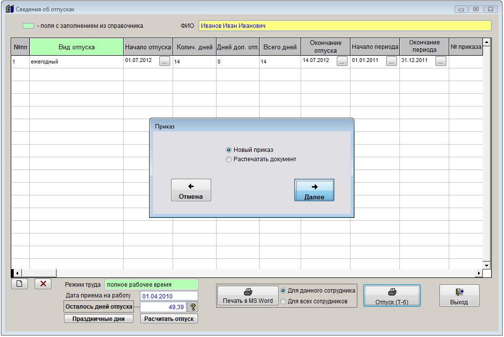 Приказ на отпуск Т-6 сформируется в установленном Microsoft Word либо при соответствующей настройке в OpenOffice Writer.