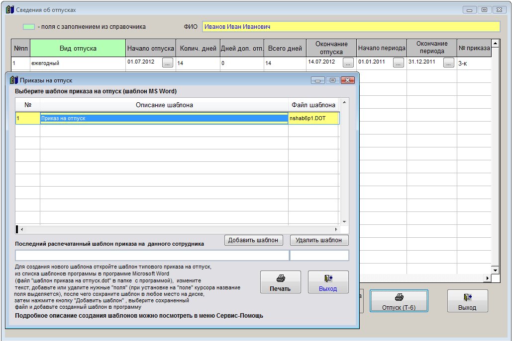 Откроется окно, в котором можно распечатать приказ на отпуск Т-6 на базе шаблона, добавить в программу свои шаблоны приказов.