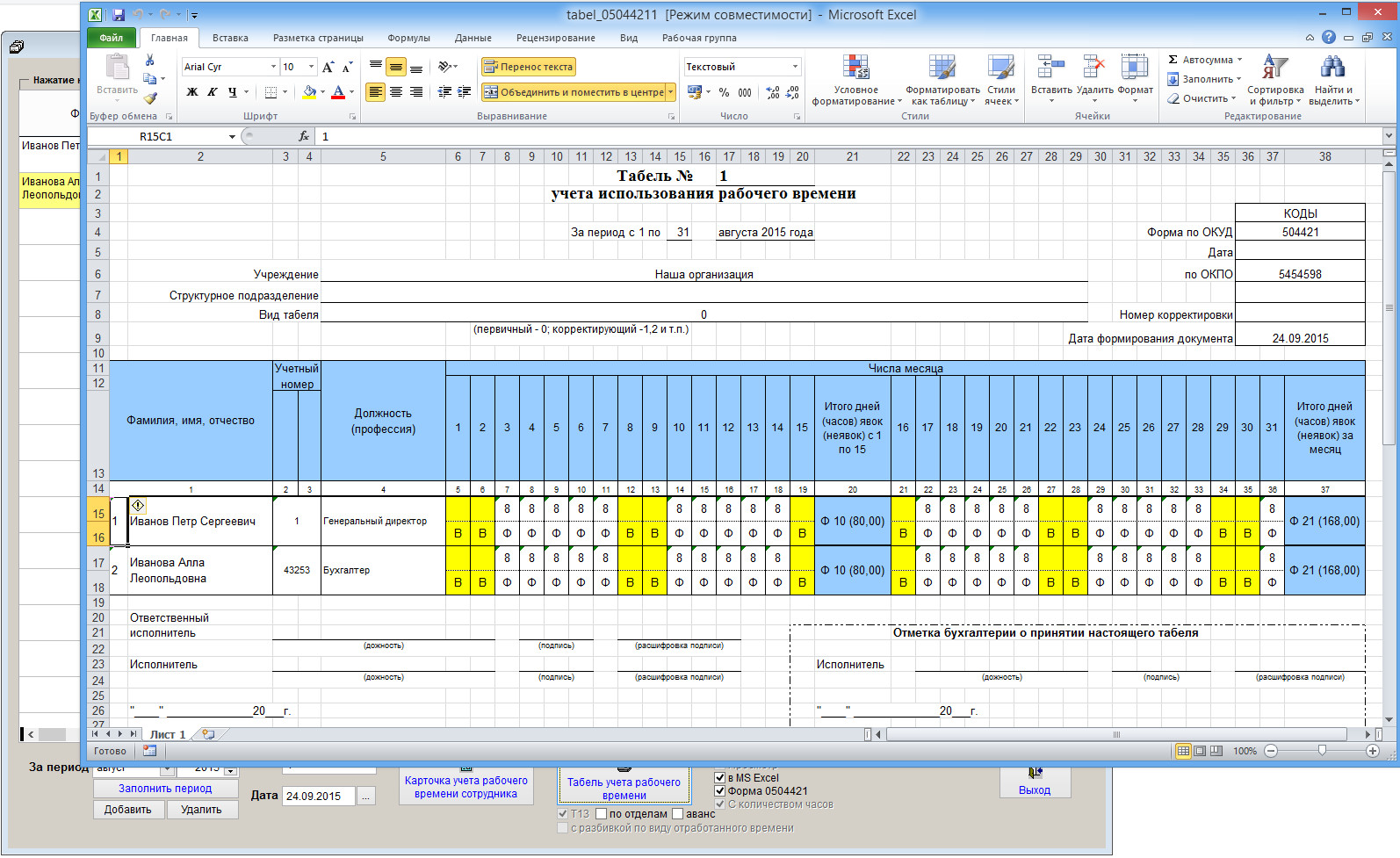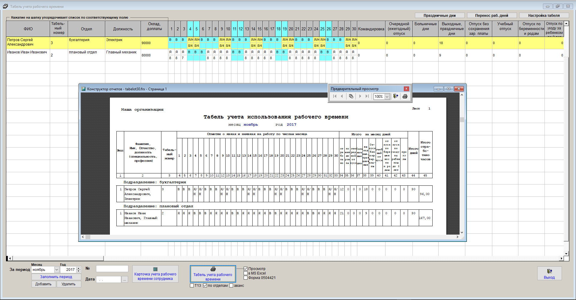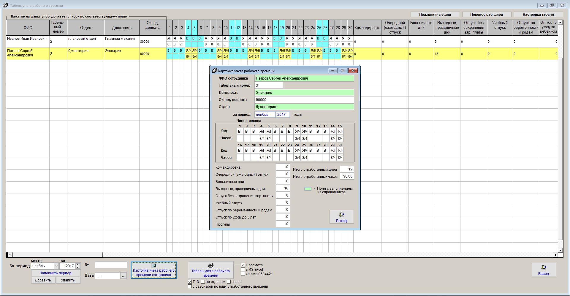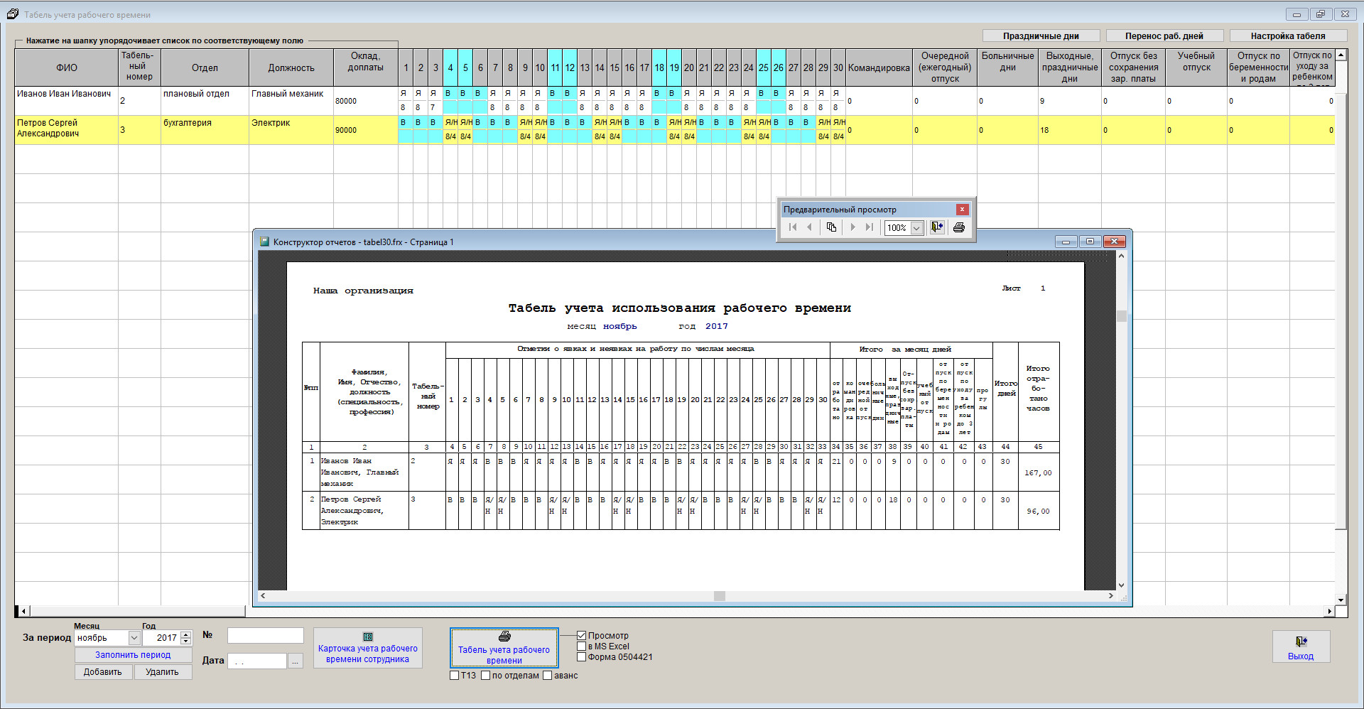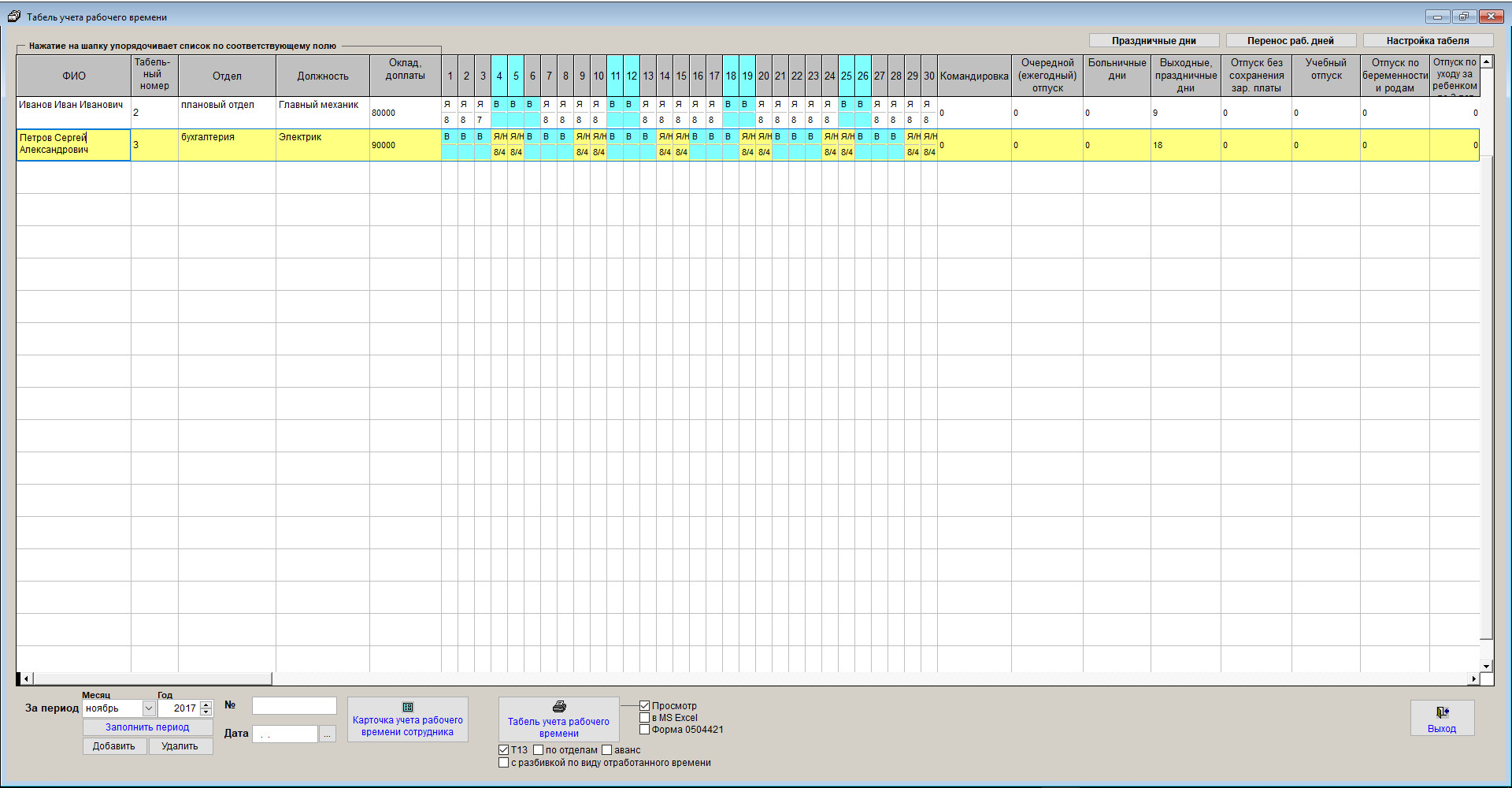 Табель будет заполнен в соответствии с графиками работы сотрудников, заданными условными обозначениями и содержимым разделов карточки сотрудников.