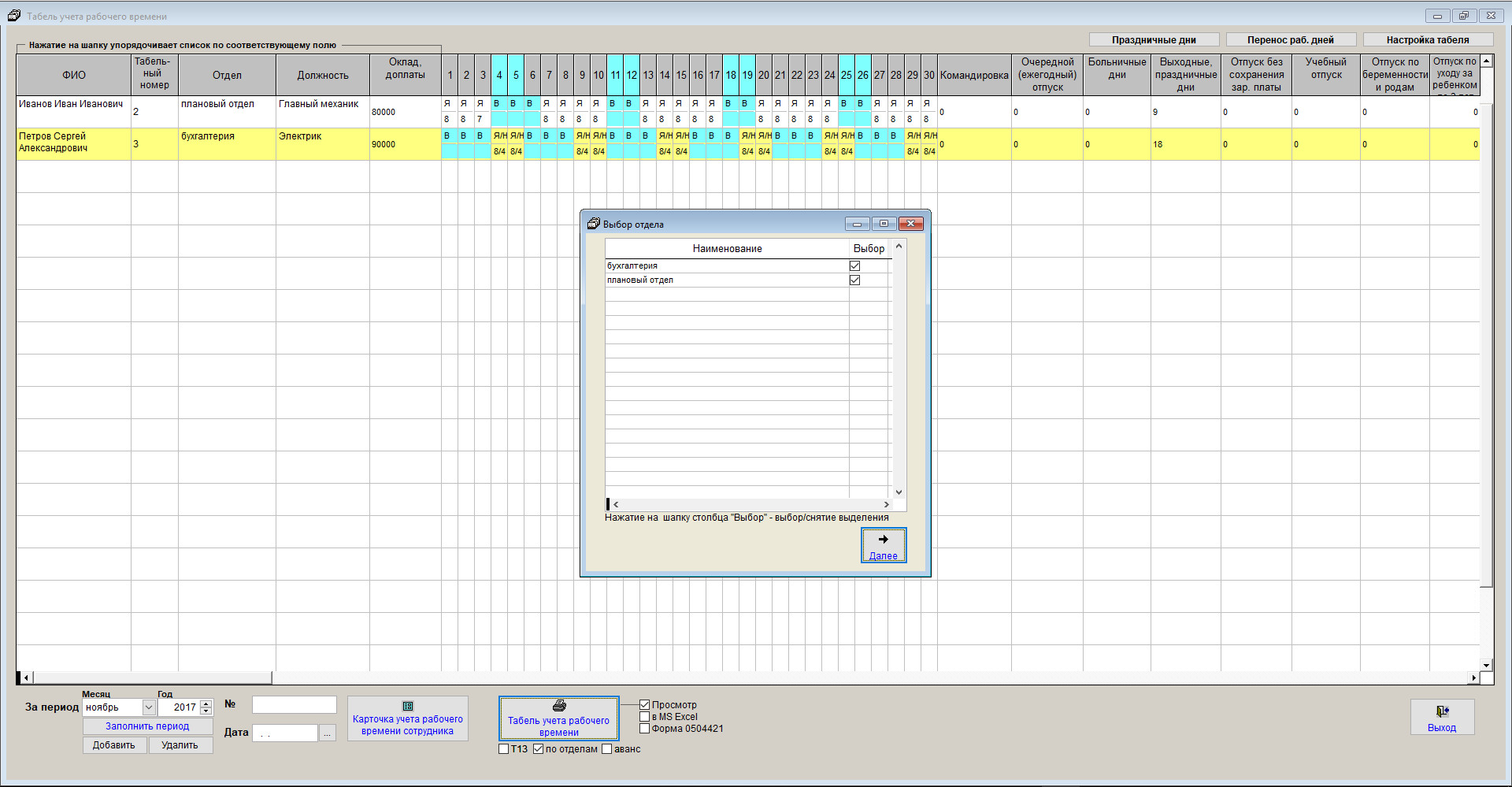 Будет сформирован табель для выбранных отделов с разбивкой по отделам.