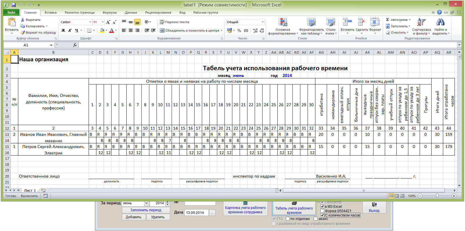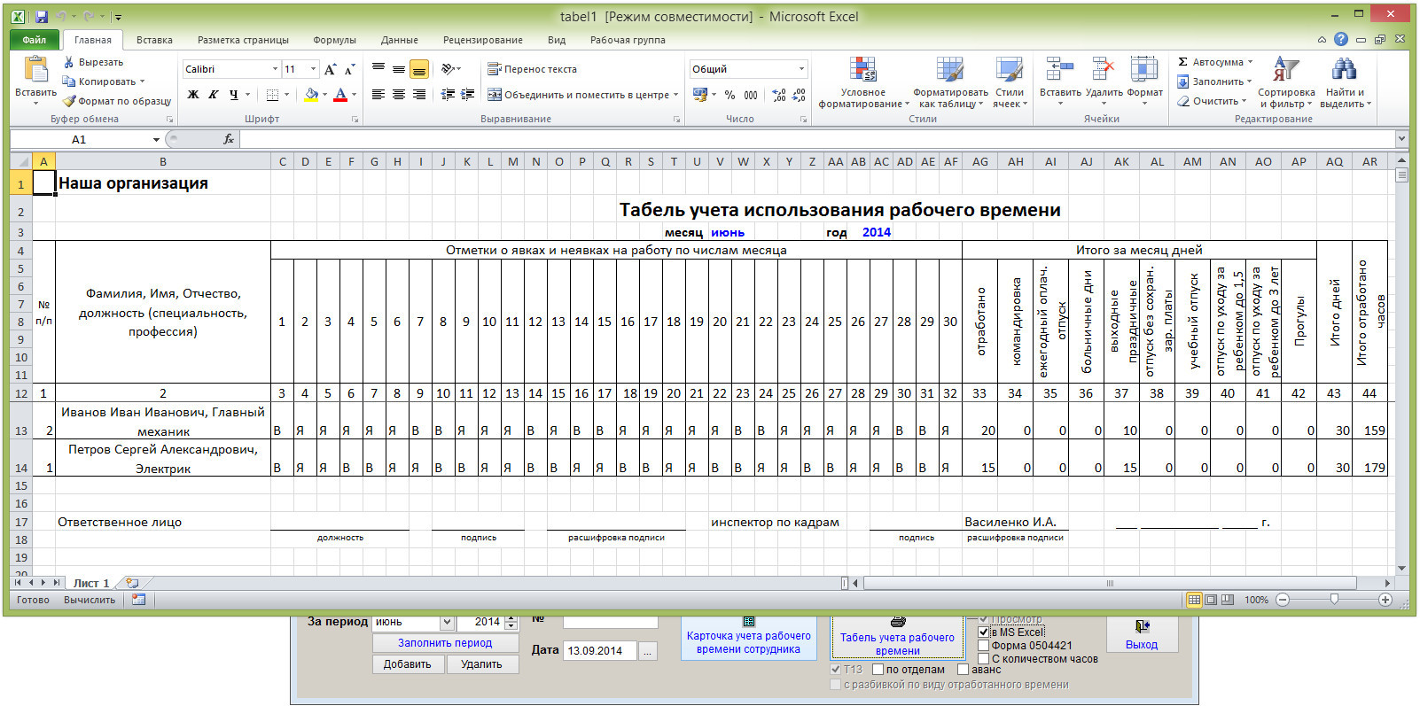 Табель с учетом отработанных часов по дням месяца будет сформирован в MS Excel (OO Calc).