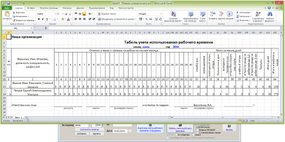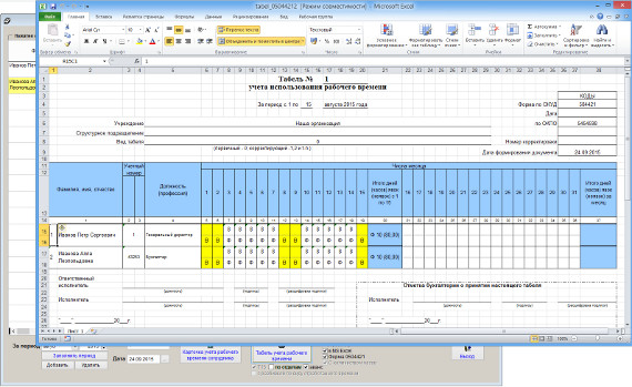 В программе есть возможность формирования табеля в MS Excel (OO Calc).