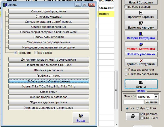 Для формирования и печати табеля учета рабочего времени откройте журнал сотрудников и нажмите кнопку "Отчеты".