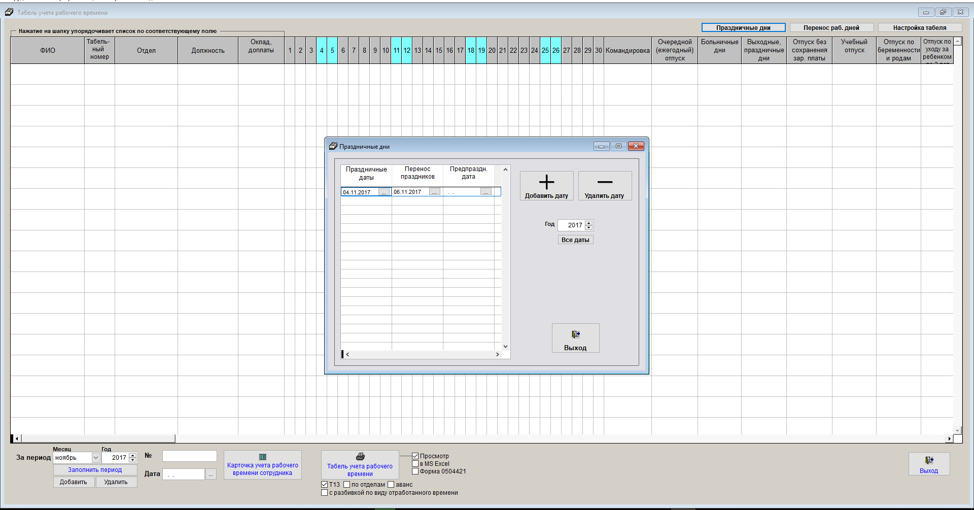 Перед заполнением табеля учета рабочего времени необходимо заполнить праздничные дни.
