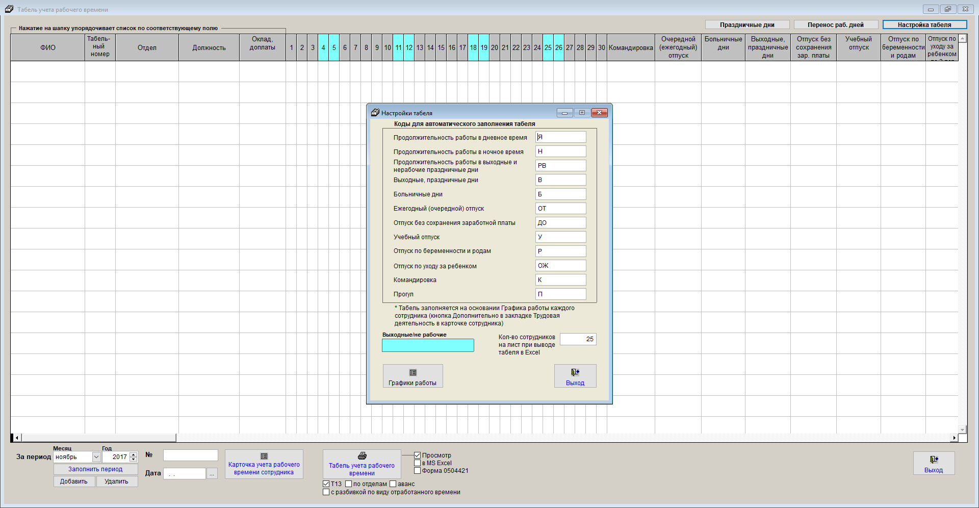 Условные обозначения можно настроить в разделе Настройка табеля, для этого нажмите кнопку "Настройка табеля" справа над таблицей.