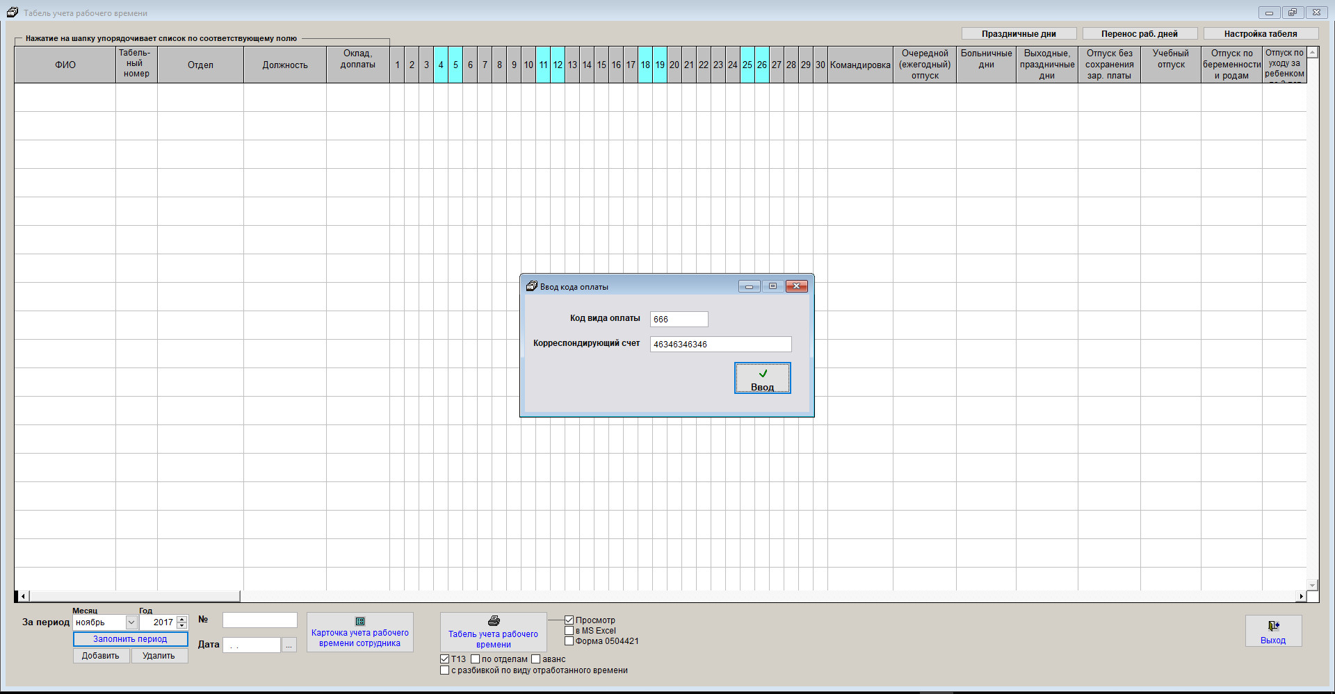 Затем заполните номер и дату табеля.