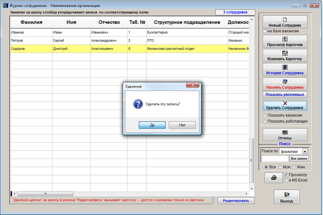 Если Вы уверены, что хотите удалить сотрудника, нажмите "Да".