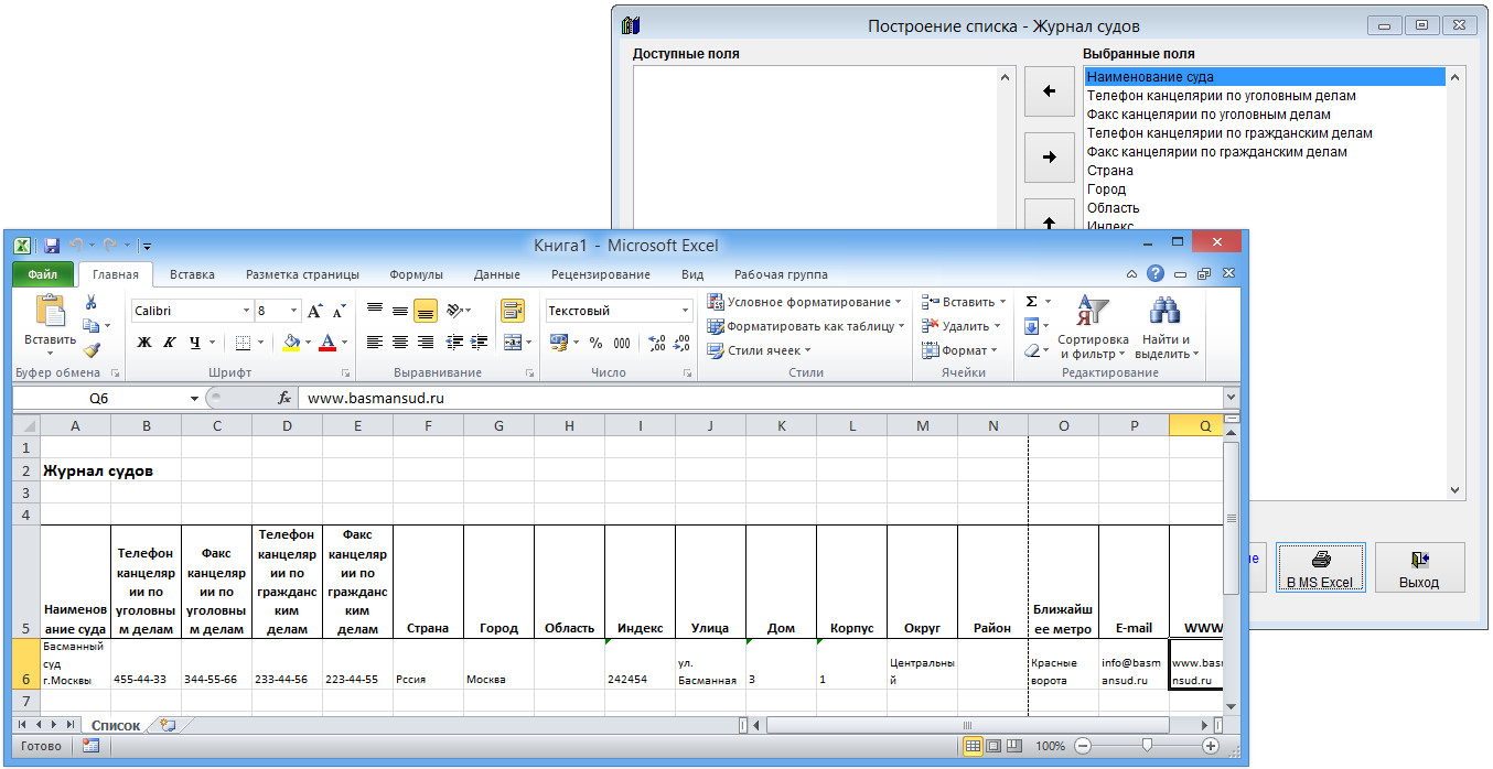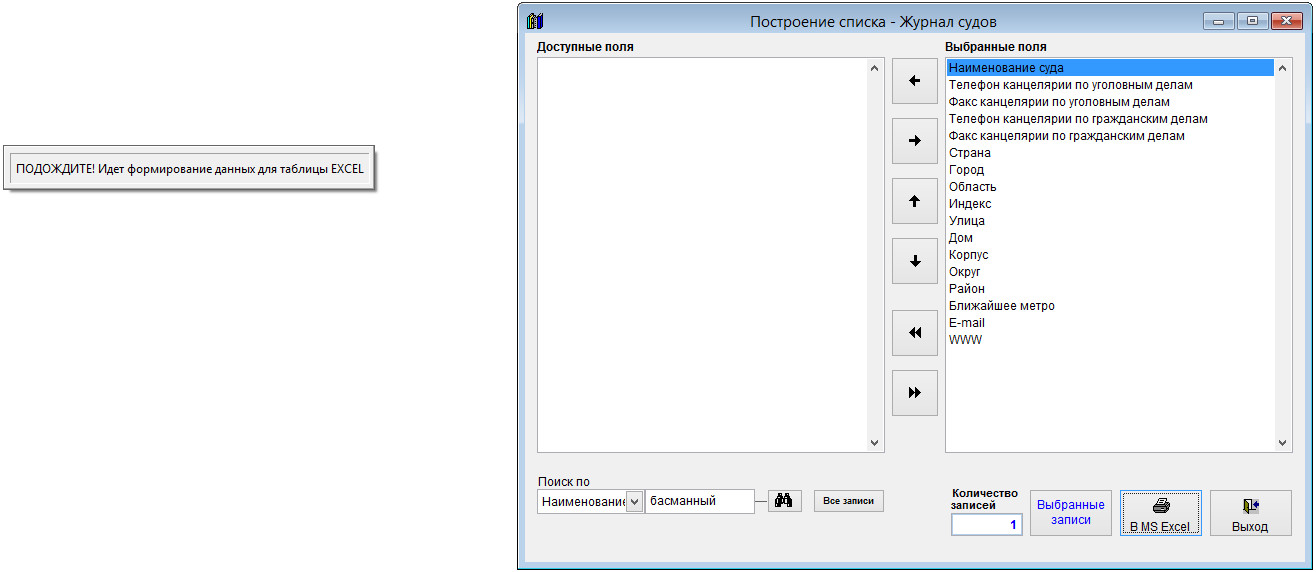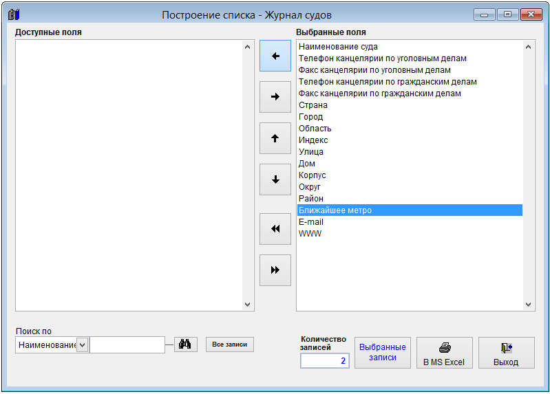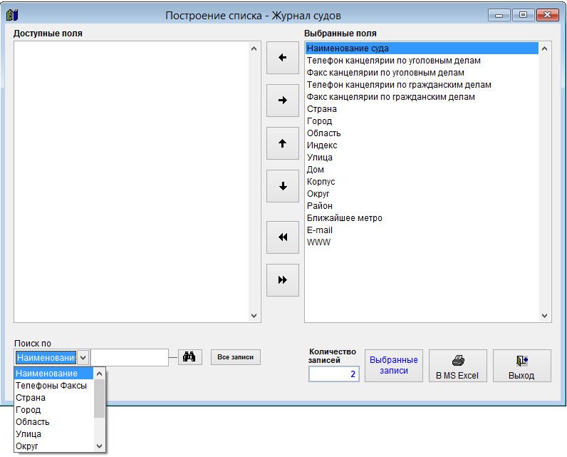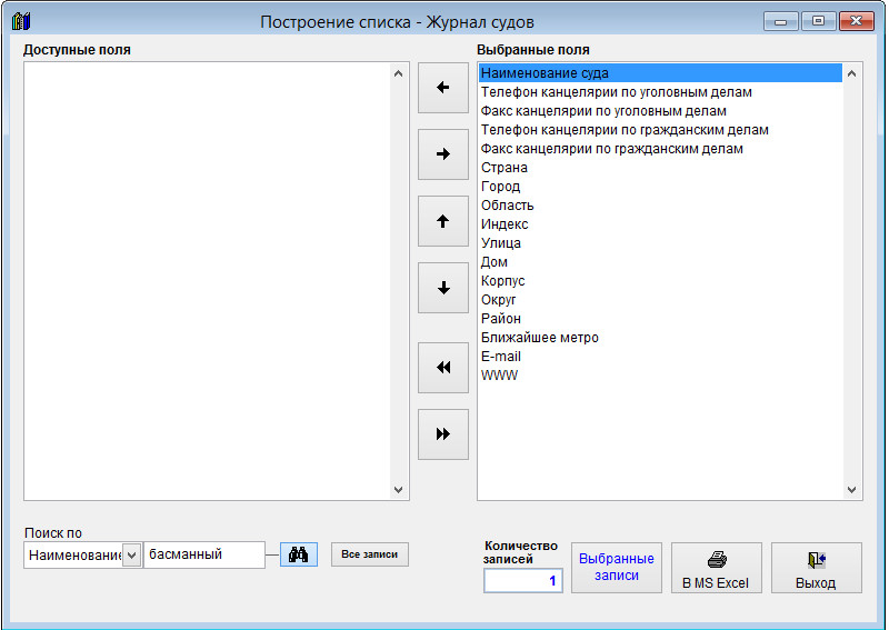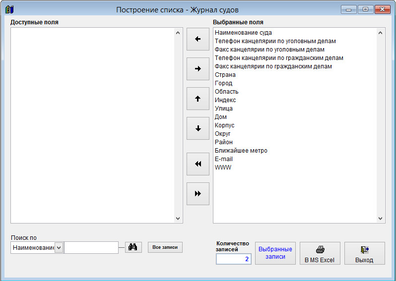 В окне настройки выберите те поля карточки суда, которые требуется экспортировать в MS Excel (OO Calc).