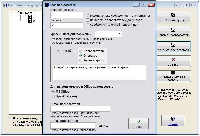 В качестве Пользователя документа (входящего, исходящего, внутреннего документа, иска, жалобы, претензии, доверенности, коммерческого предложения, договоры) может выступать группа пользователей (из раздела меню Сервис-Пользователи).