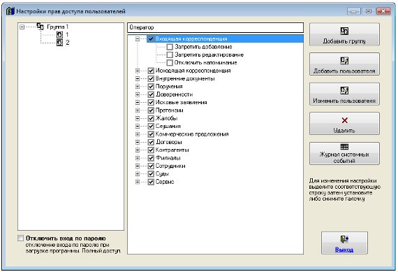 При отключенной галочке "Отключить вход по паролю" при входе в программу станет появляться окно контроля доступа пользователей.