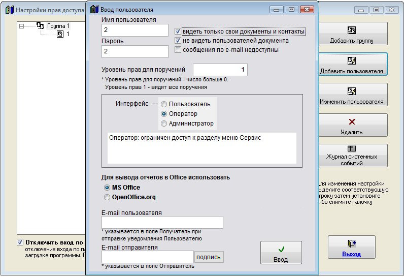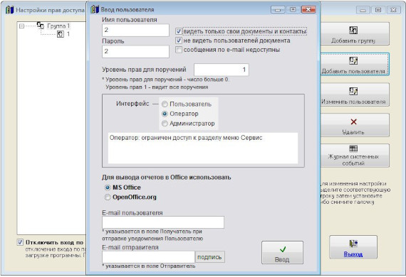 При входе в программу пользователь будет иметь те права доступа, которые были заданы при создании/изменении профиля данного пользователя.