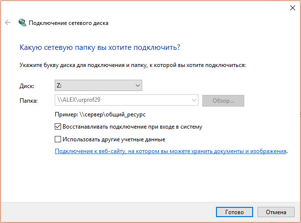Имя диска выбирается любое из доступных, например Z, затем нажмите кнопку "Готово".