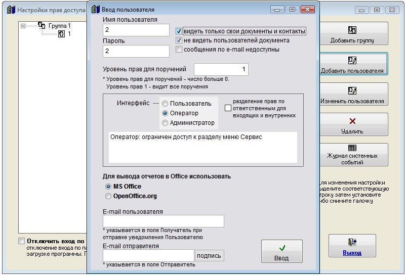 В качестве Пользователя документа (входящего, исходящего, внутреннего документа, иска, жалобы, претензии, доверенности, коммерческого предложения, договоры) может выступать группа пользователей (из раздела меню Сервис-Пользователи).