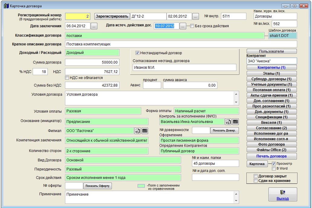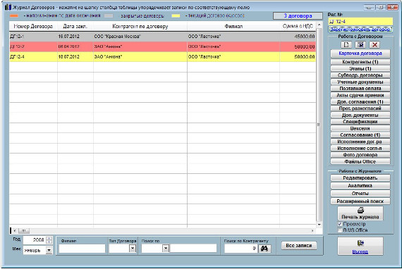 Также по данным договорам будет осуществляться цветовое оповещение в журнале договоров.