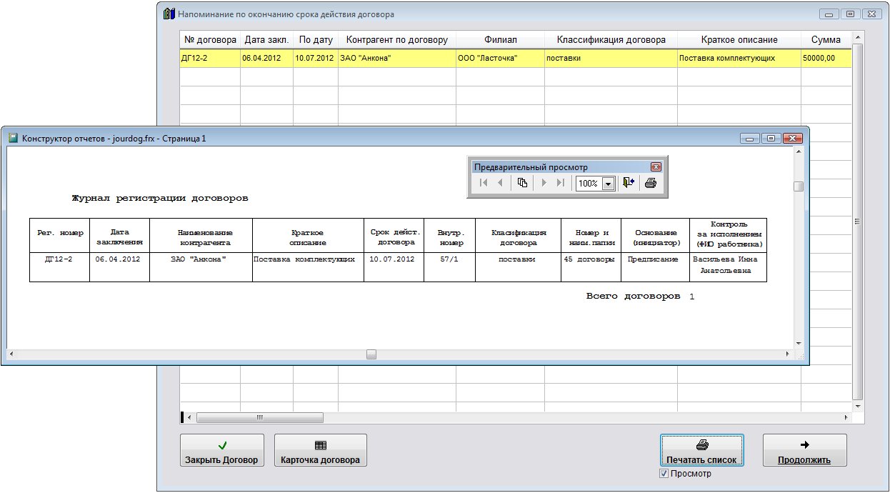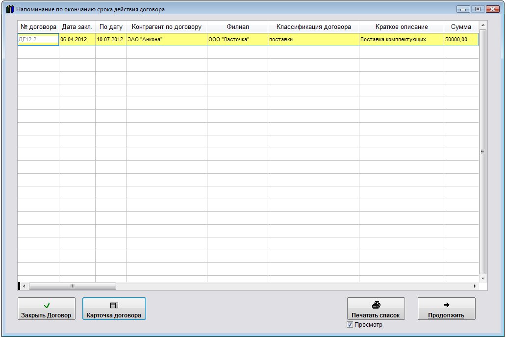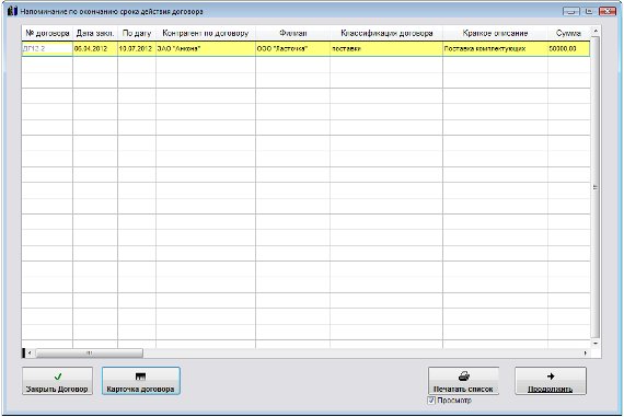 В данном окне оповещения можно закрыть выбранный договор, просмотреть карточки договоров, по которым осуществляется оповещение и при необходимости распечатать список договоров с оповещением.