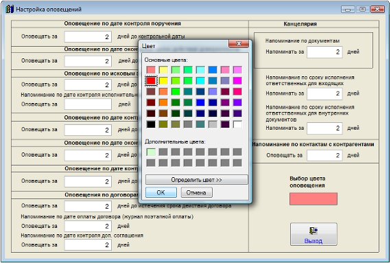 Для выбора цвета истекающих договоров щелкните мышью по красному прямоугольнику, выберите нужный цвет и нажмите ОК.