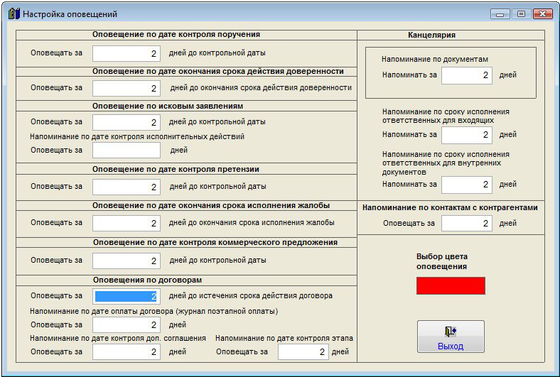 В программе "Юридический офис" можно организовать оповещение по дате истечения действия договора при загрузке программы, также по данному критерию существует цветовое оповещение в журнале договоров.
