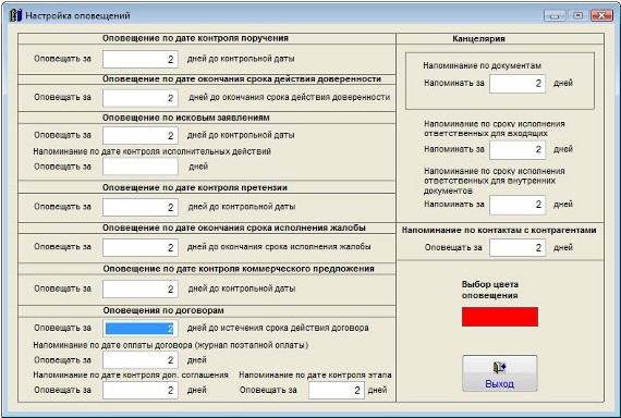 В поле "Оповещать за" в блоке Оповещение по договорам Вы можете установить количество дней, за которое до даты истечения действия договора будет срабатывать оповещение.