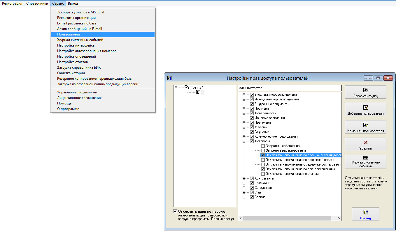 В правой части окна раскройте плюсик блока Договоры, установите мышкой курсор на на опцию "Отключить напоминание по сроку окончания договора" и затем установите (для отключения оповещения) либо снимите (для включения) соответствующую галочку.