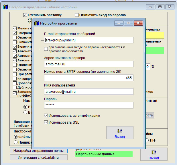 Для настройки возможности уведомлений по e-mail требуется указать в программе параметры используемого почтового сервера.