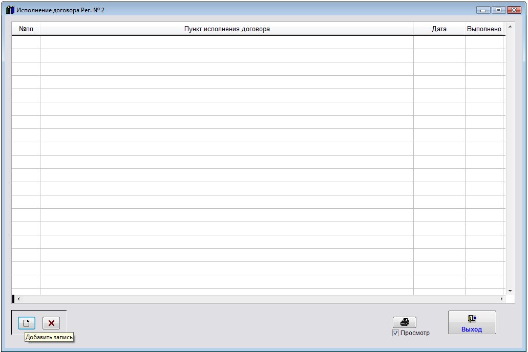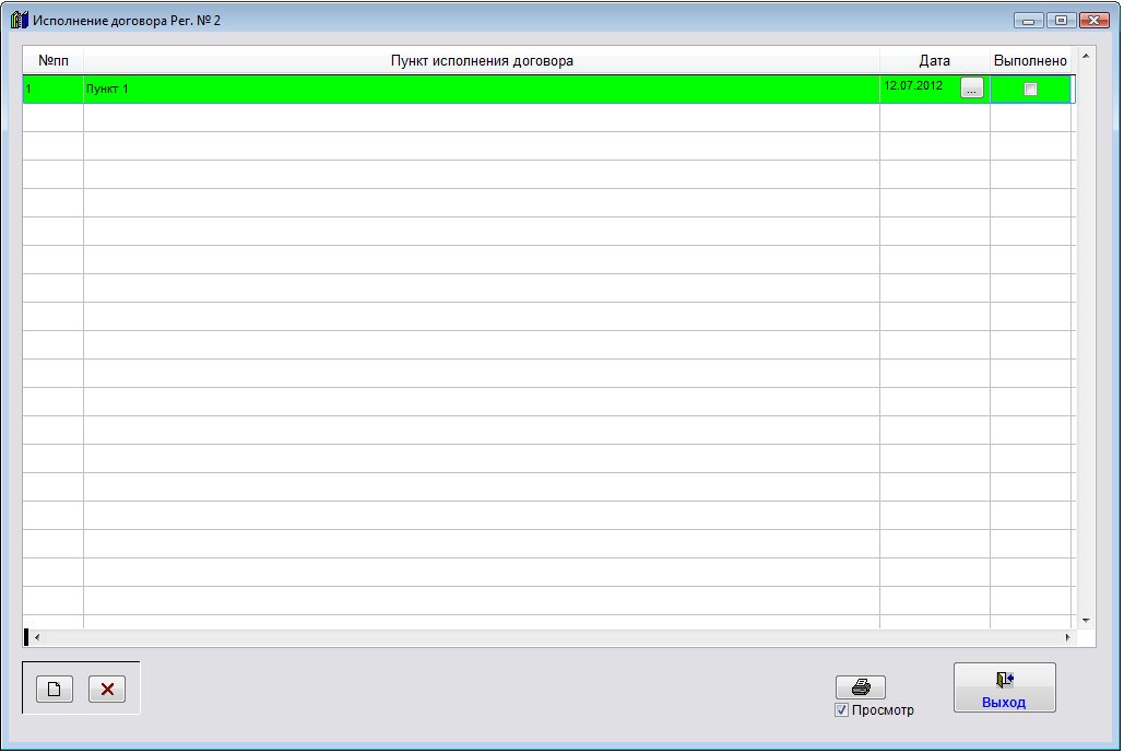 Для внесения исполнения по договору нажмите кнопку "Исполнение дог-ра" (в группе кнопок в правой части формы карточки договора либо журнала договоров).