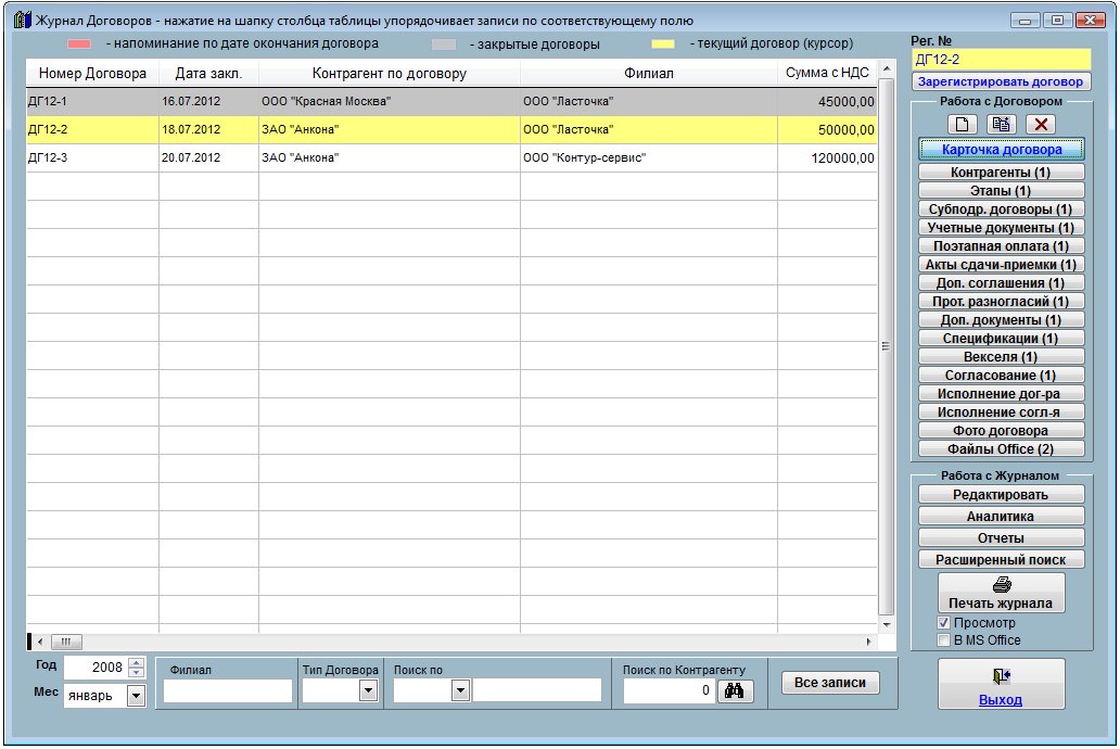 Для внесения изменений в зарегистрированный договор в журнале договоров установите курсор на договор с нужным номером.