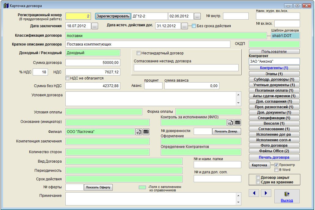 Откроется карточка договора.