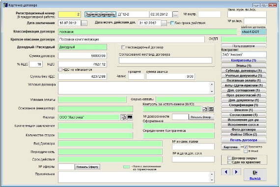 Внесите нужные изменения в карточку договора, после внесения изменений нажмите кнопку "Выход".