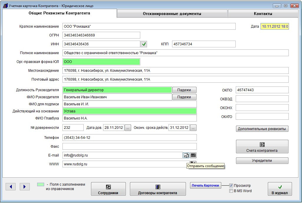 Для отправки уведомления контрагенту по e-mail в карточке контрагента нажмите кнопку "Отправить сообщение" справа рядом с полем "E-mail".