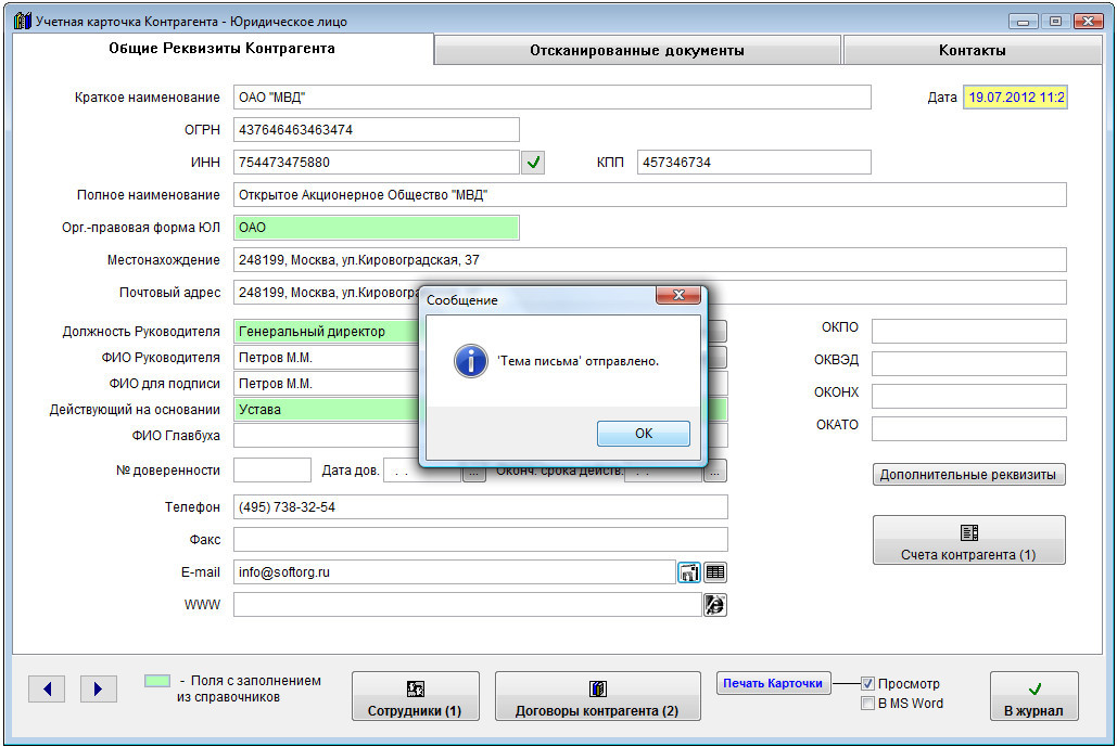 E-mail получателя сообщения заполнится автоматически из поля "E-mail" в карточке контрагента.