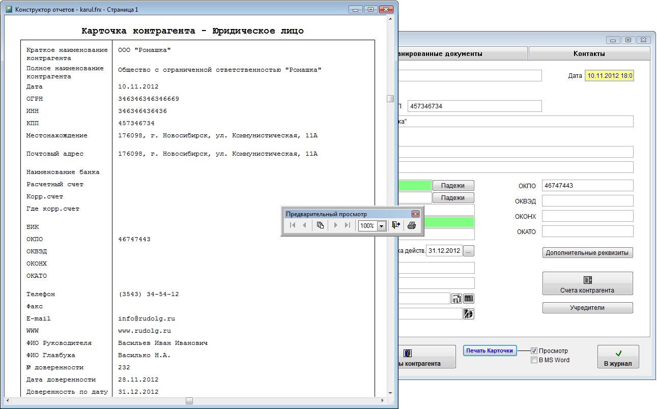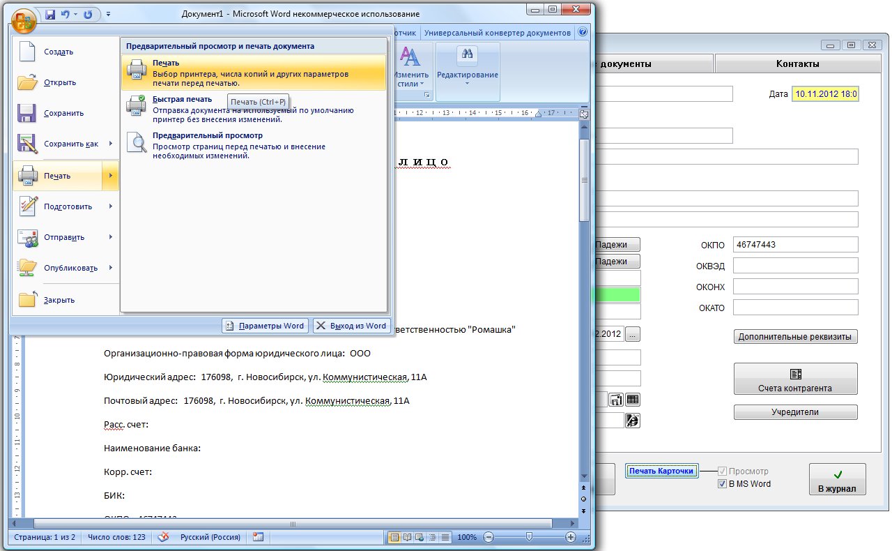 Для вывода карточки контрагента в установленный Microsoft Word либо, при соответствующей